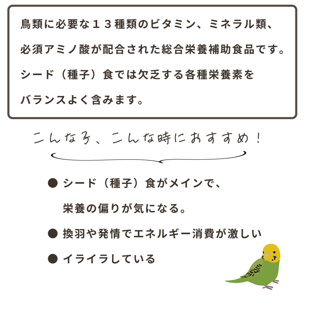 鳥類に必要な13種類のビタミン、ミネラル類、必須アミノ酸が配合された総合栄養補助食品です。