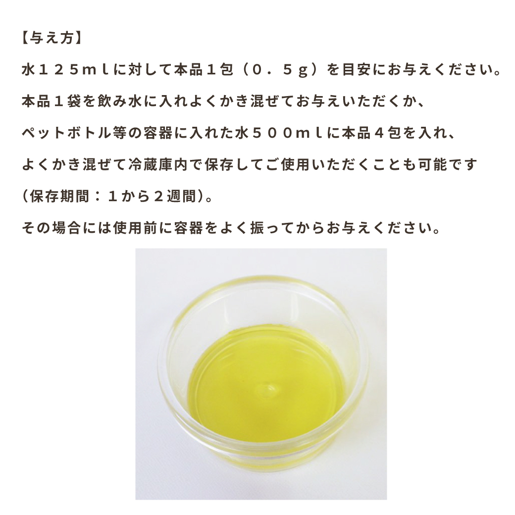 本品1袋を飲み水に入れよくかき混ぜてお与えいただくか、ペットボトル等の容器に入れた水500mlに、本品4包を入れ、よくかき混ぜて冷蔵庫内で保存してご使用いただくことも可能です(保存期間:1から2週間)。