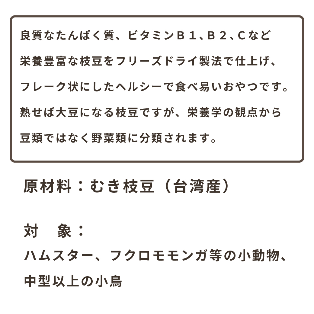 良質なたんぱく質、ビタミンB1、B2、Cなど栄養豊富な枝豆をフリーズドライ製法で仕上げ、フレーク状にしたヘルシーで食べ易いおやつです。