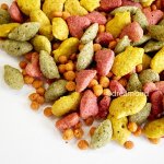 約5〜10mmのハートや葉っぱの楽しい形のペレットと約2〜5mmの小粒なボール状のペレットのミックスです。