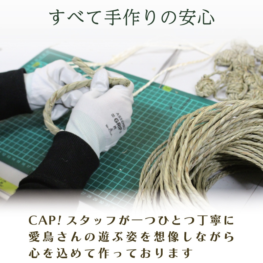 ブランコ部分はいぐさ、足場・ケージへのとりつけ用にはサイザル麻ロープを使用。